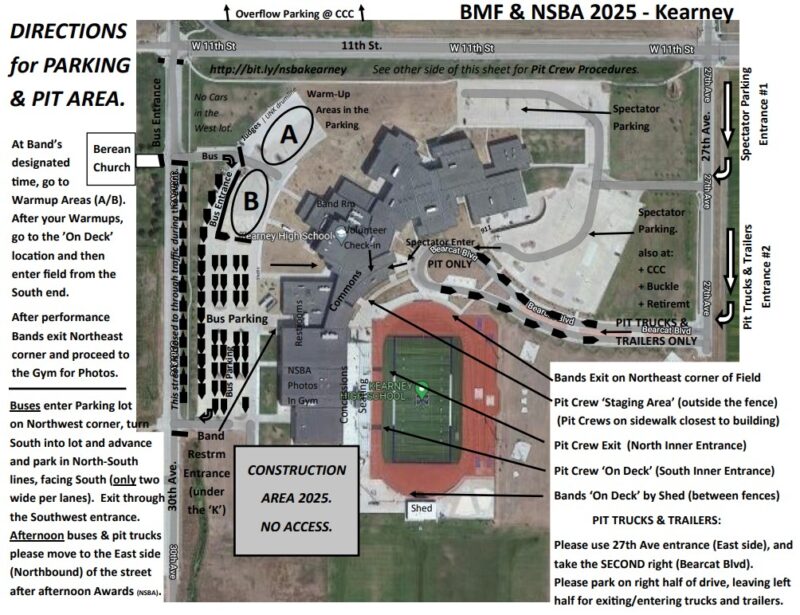 2025 PitCrew info: For the Bearcat Marching Festival, the Band equipment will be in the KHS Band room. The Band is to assemble at 2:00 pm in the Band room, so our Kearney Pit Crew needs to be available by 1:45 pm to help move all the equipment to the South end of the HS parking lot. We begin staging our pit crew outside the fence at 3:00 pm so we need to start moving equipment from the Band room at 2:45 pm so we are outside on the front sidewalk by 3:00 pm. At 3:15 pm we move our Pit under the stadium (On Deck). We follow Columbus, so when they are On Deck (their Pit is under the stadium), our Pit needs to be in the staging area outside the fence. Be sure to stay on the sidewalk by the offices so that the Columbus band can enter the field and perform. After the Columbus band enters the field, the North Platte Pit will have exited the field and then our KHS Pit will enter under the stadium and be On Deck. Be in the order we enter the field. Remember that this is in reverse order from what we do at UNK for football halftime shows. The pit will be in reverse order of UNK. Once the Pit is set out on the field, we stand back against the front of the stadium while they perform (3:30 pm). After their performance, we will move everything to the Band Room. If you can help with getting equipment to the Band room and with cleanup, that would be appreciated.